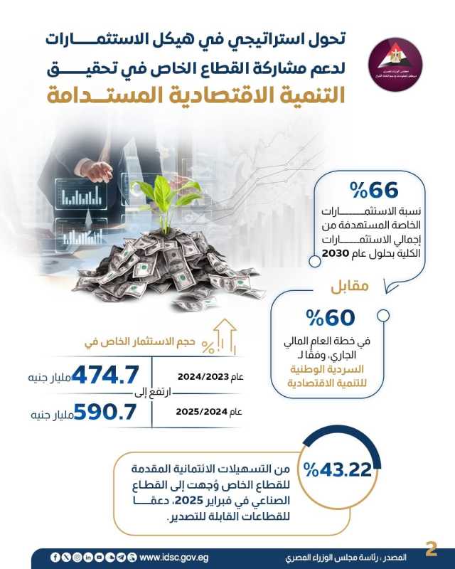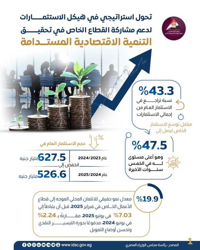وأوضح الانفوجرا ان حصة الاستثما الخاص ارتفعت إلى 47.5% من إجمالي الاستثمارات، وهو أعلى مستوى له خلال خمس سنوات، مقابل تراجع الاستثمار العام إلى 43.