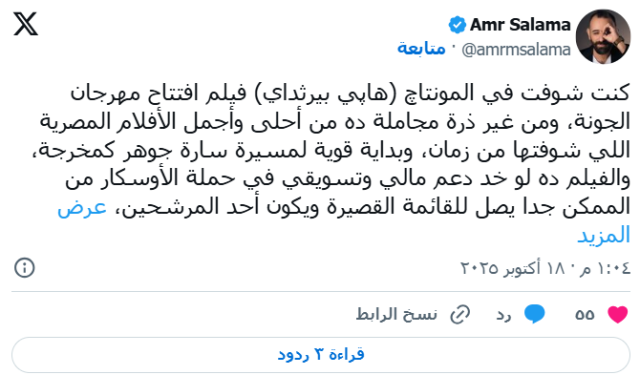 وكتب عمرو سلامة: "كنت شوفت في المونتاج" هاپي بيرثداي" فيلم افتتاح مهرجان الجونة، ومن غير ذرة مجاملة ده من أحلى وأجمل الأفلام المصرية اللي شوفتها من زمان، وبداية قوية لمسيرة سارة جوهر كمخرجة".