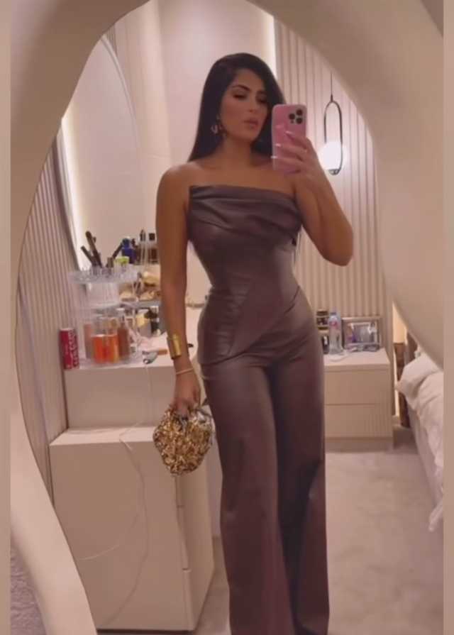 وظهرت زوجة الفنان في الصور، مرتديه سوت جلد باللون البني ذا تصميم جذاب لتكشف عن جمالها ورشاقتها، وتركت شعرها الأسود الطويل منسدلا بين كتفيها بطريقة ناعمة وجذابة تتناسب مع إطلالتها.