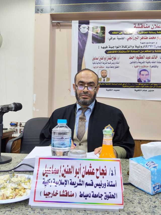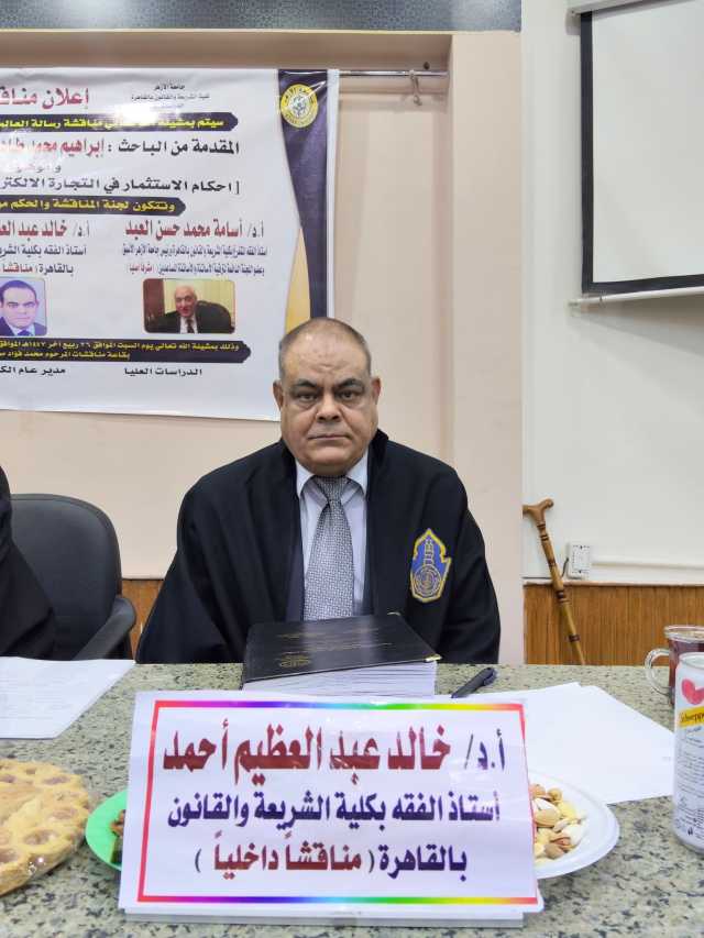 ضمت لجنة المناقشة الدكتور أسامة العبد رئيس جامعة الأزهر الأسبق و عضو مجلس النواب المصري، مشرفا، و الدكتور خالد عبدالعظيم و الدكتور ناجح أبو العينين، مناقشين.