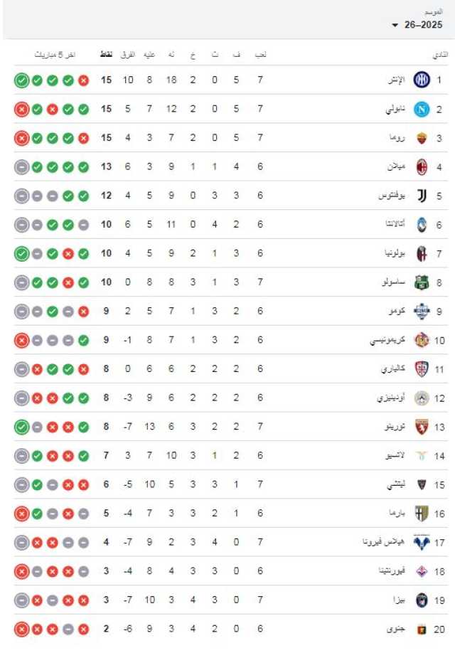 يعتلى فريق الكرة الاول بنادى إنتر ميلان صدارة جدول ترتيب الدوري الإيطالي، بعد الفوز على روما بهدف نظيف، في المباراة التي جمعت بينهما اليوم، ضمن منافسات الجولة الـ7 من الدوري الإيطالي.