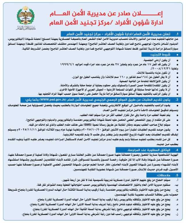 أعلنت مديرية #الأمن_العام / إدارة شؤون الأفراد – مركز تجنيد الأمن العام، عن حاجتها لتجنيد عدد من #الذكور و #الإناث لحساب مديرية الأمن العام (النقص العام) بالصبغة العسكرية، بمهنة “مسلّح” لحملة شهادات #البكالوريوس، #الدبلوم (شامل ناجح)، التوجيهي الناجح فما دون ولغاية الصف العاشر الناجح، وبمهنة “مهندس” بمختلف التخصصات للذكور فقط، إضافة إلى مهنة “سائق سيارة / سائق دراجة نارية” للذكور فقط من حملة شهادة التوجيهي الناجح فما دون ولغاية الصف العاشر الناجح.