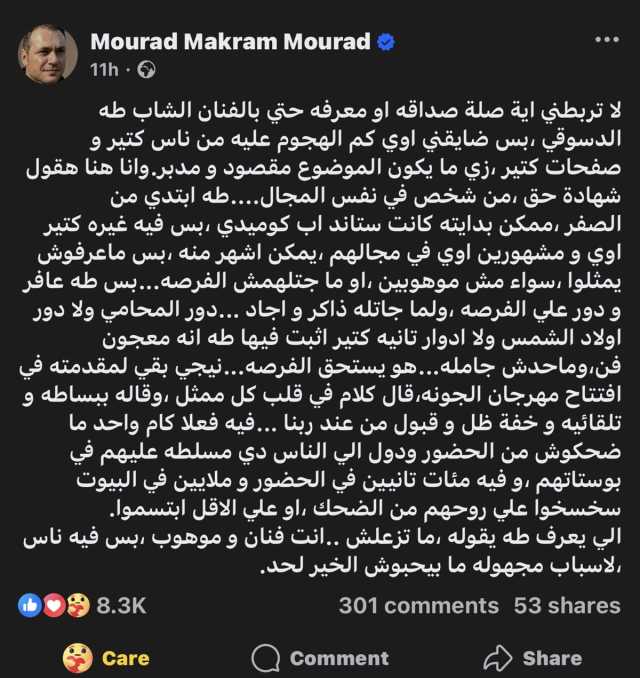 وكتب مراد مكرم: “لا تربطني اية صلة صداقه او معرفه حتي بالفنان الشاب طه الدسوقي ،بس ضايقني اوي كم الهجوم عليه من ناس كتير و صفحات كتير ، زي ما يكون الموضوع مقصود و مدبر”.