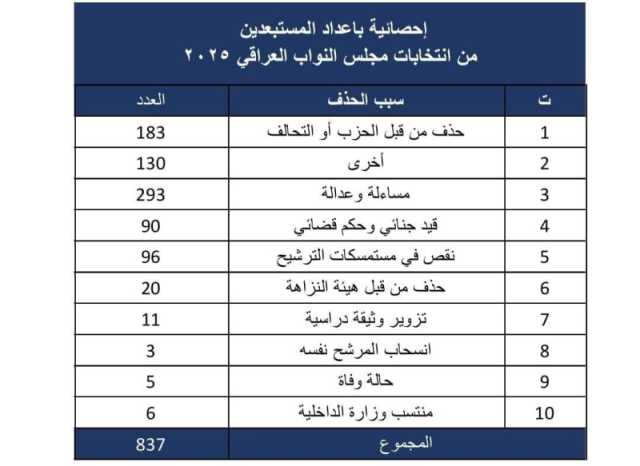 آخر تحديث: 19 أكتوبر 2025 - 11:34 ص بغداد/ شبكة أخبار العراق- أعلنت المفوضية العليا المستقلة للانتخابات، الاحد، إحصائية بعدد المستبعدين من انتخابات مجلس النواب العراقي لعام 2025، مبينة أن عددهم بلغ 837 مرشحًا لأسباب مختلفة، بينها المساءلة والعدالة، وقرارات قضائية، ونقص في مستمسكات الترشيح، وحذف من قبل الأحزاب أو التحالفات، وكما هو موضح أدناه: