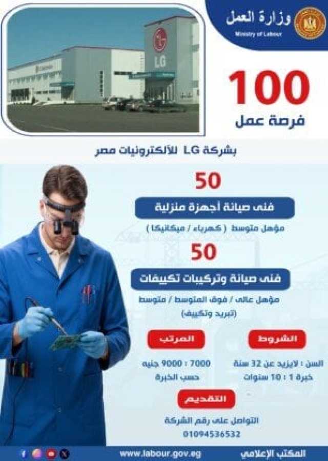 رواتب تصل لـ9 آلاف جنيه.. «العمل» تعلن عن 100 فرصة شاغرة بشركة LG للإلكترونيات