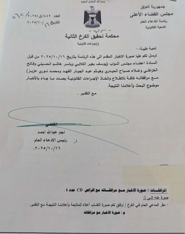 آخر تحديث: 19 أكتوبر 2025 - 12:23 م بغداد/ شبكة أخبار العراق- أحالت رئاسة الادعاء في العراق، شكوى لأعضاء في مجلس النواب ضد رئيس مجلس الوزراء محمد شياع السوداني إلى المحكمة المختصة بالتحقيق في قضايا النزاهة عن عدد من المخالفات القانونية.ومقدمو الشكوى ستة نواب وهم كل من: يوسف الكلابي، وياسر الحسيني، وفالح الخزعلي، وعلاء الحيدري، وهيثم الفهد، ومحمد نوري.