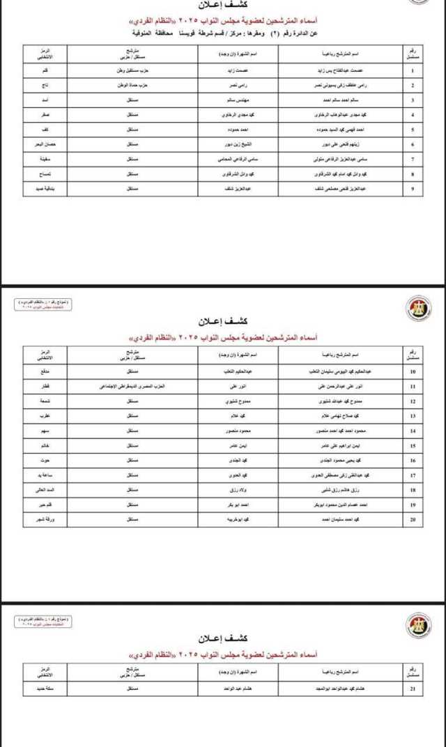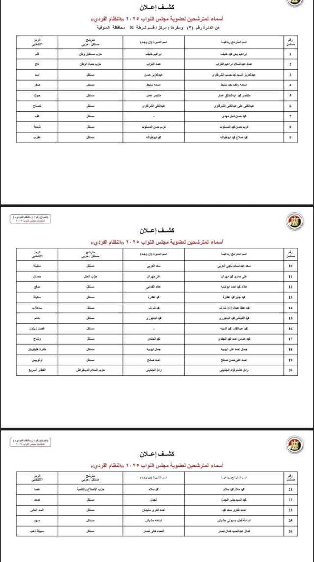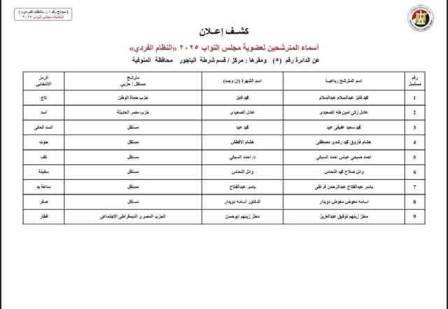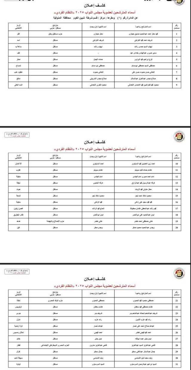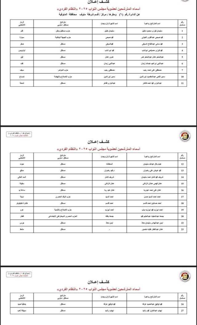 الوطنية للانتخابات تكشف عن الأسماء المبدئية لمترشحي الفردي في دوائر المنوفية لانتخابات النواب 2025