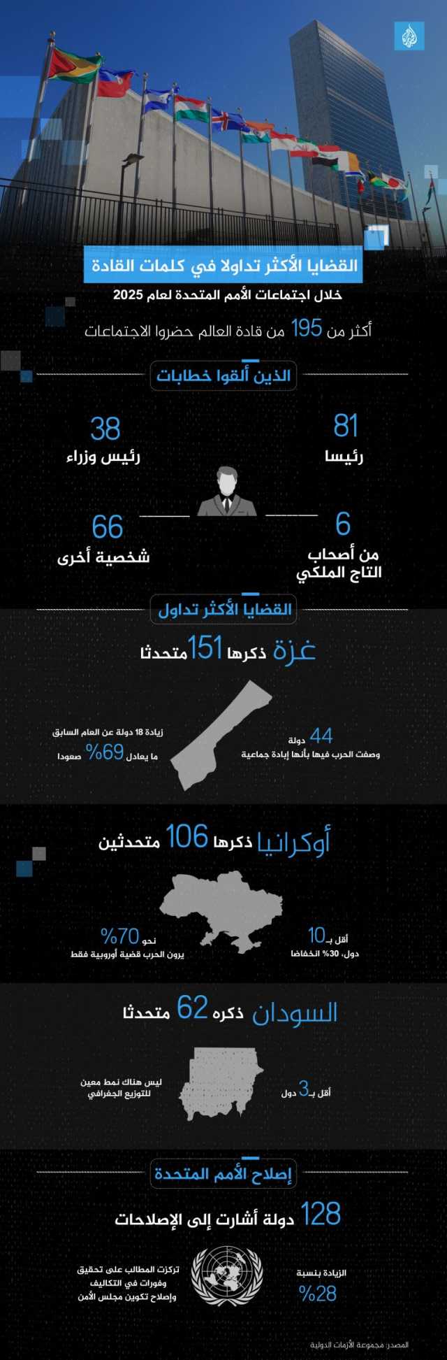 الحضور المتزايد لقضية غزة واستخدام توصيف "إبادة جماعية" من عدد غير مسبوق من الدول. التحول في الاهتمام بأوكرانيا، وتراجع حضورها خارج الناتو والاتحاد الأوروبي رغم استمرار النزاع. استمرار الأزمة السودانية كأكبر أزمة إنسانية دون اهتمام عالمي متسق أو واضح. تصاعد أولوية إصلاح الأمم المتحدة خاصة في ضوء التحديات المالية والسياسية، وتزايد النقاش حول مبادرة "الأمم المتحدة 80". تبرز خطابات القادة في الجمعية العامة كمؤشر مهم لتوجه الرأي العام العالمي والسياسات المستقبلية للأمم المتحدة. إعلانوتعقد الجمعية العامة للأمم المتحدة جلساتها سنويا في سبتمبر/أيلول بنيويورك، وتشهد النقاشات العامة مشاركة أكثر من 190 قائدا وممثلا للدول الأعضاء، وتشكل هذه الجلسات فرصة لاستعراض القضايا الدولية الكبرى ورسم السياسات الأممية للعام التالي.