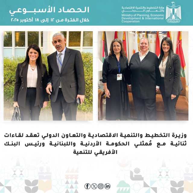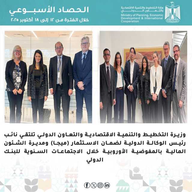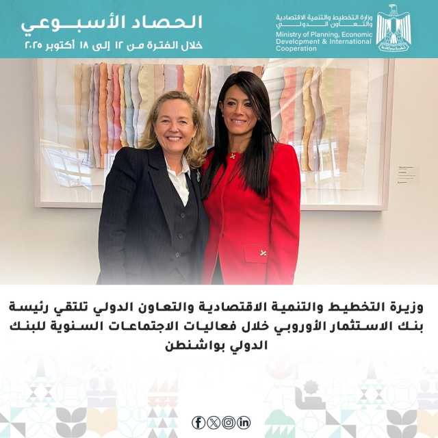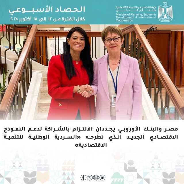 وأصدرت وزارة التخطيط والتنمية الاقتصادية والتعاون الدولي، والبنك الأوروبي لإعادة الإعمار والتنمية (EBRD)، أحد أكبر بنوك التنمية متعددة الأطراف في العالم، بيانًا مُشتركًا حول تطورات الإصلاح الاقتصادي والهيكلي في مصر، وإطلاق «السردية الوطنية للتنمية الاقتصادية: السياسات الداعمة للنمو والتشغيل»، وبحثت مع ناديا كالفينو، رئيسة بنك الاستثمار الأوروبي، تعزيز الشراكة ومناقشة عدد من ملفات التعاون المشتركة.