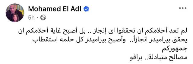 وكتب العدل، على حسابه الشخصي بموقع فيسبوك: “لم تعد أحلامكم أن تحققوا أي إنجاز، بل أصبح غاية أحلامكم أن يحقق بيراميدز إنجازاً.. وأصبح بيراميدز كل حلمه استقطاب جمهوركم.