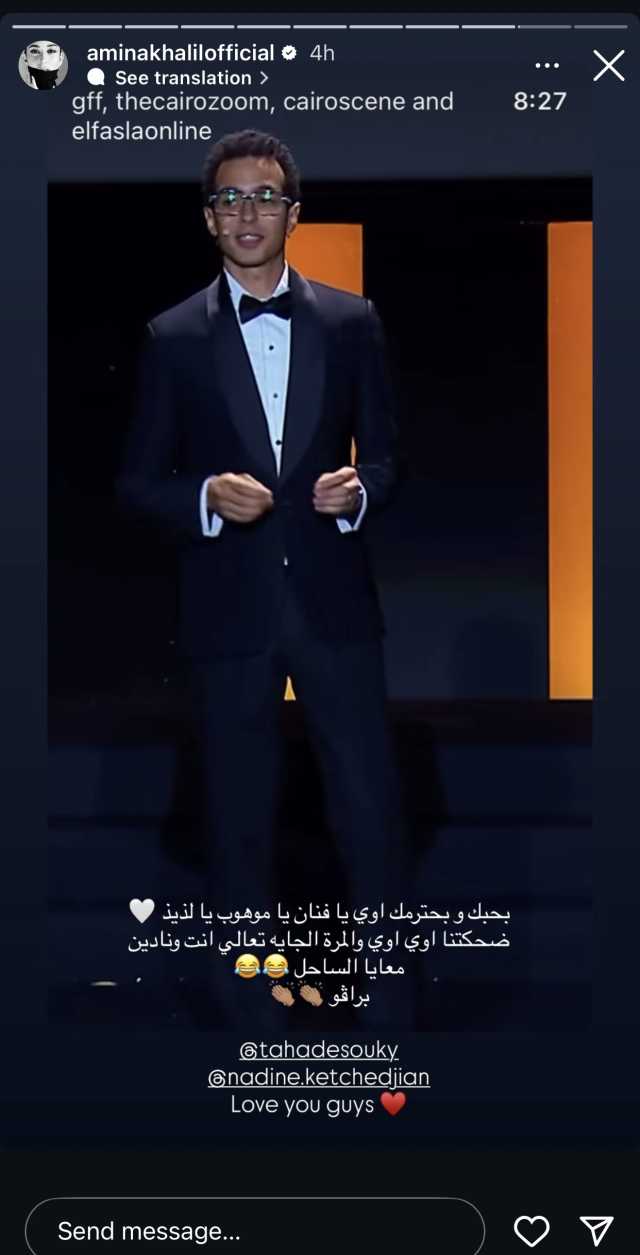 وكتبت أمينة خليل، عبر صفحتها على موقع التواصل الاجتماعي إنستجرام : " بحبك وباحترمك أوي يافنان يا موهوب يا لذيذ ضحكتنا اوي اوي، المرة الجاية تعالى أنت ونادين معايا الساحل، برافو".