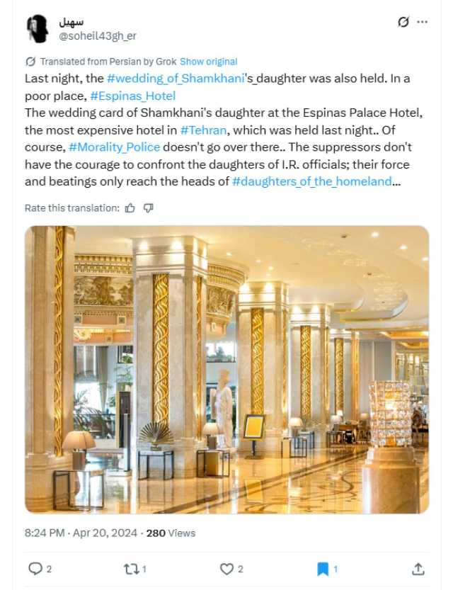 وقال التعليق: "في أول ظهور له في مكان عام منذ محاولة إسرائيل اغتياله بعد أن قصفت غرفة نومه وأُصيب بسببها.. علي شمخاني الأمين السابق للأمن القومي الإيراني يظهر في مناسبة زواج ابنته في أحد فنادق طهران الشهيرة على أنغام حسين الجسمي".