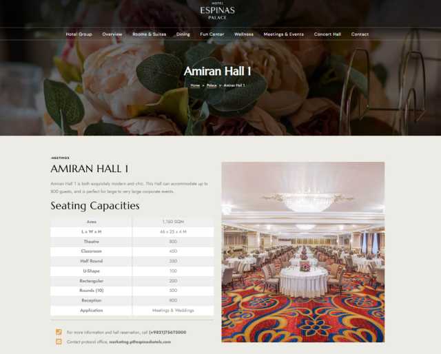 وتتسع القاعة التي تبلغ مساحتها 1150 مترًا مربعًا، لما يصل إلى 800 ضيف، وهي مخصصة للاجتماعات الكبيرة وحفلات الزفاف.