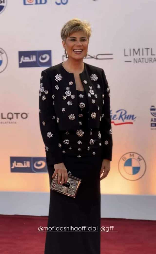 تألقت الإعلامية مفيدة شيحة على السجادة الحمراء بمهرجان الجونة السينمائي بإطلالة كلاسكية أنيقة حيث ارتدت فستان طويل ومرصع بالألماس باللون الأسود، كما اختارت لشعرها تسريحة بسيطة تلائم الإطلالة.