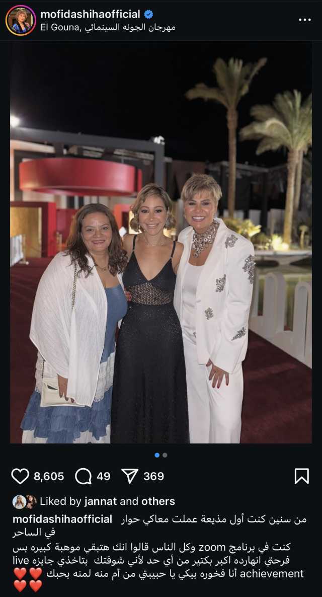 وكتبت مفيدة شيحة في رسالتها: “من سنين كنت أول مذيعة عملت معاكي حوار في الساحر، وكنت في برنامج Zoom، وكل الناس قالوا إنك هتبقي موهبة كبيرة، بس فرحتي النهارده أكبر بكتير من أي حد، لأني شوفتك بتاخدي جايزة Achievement Life، أنا فخورة بيكي يا حبيبتي.