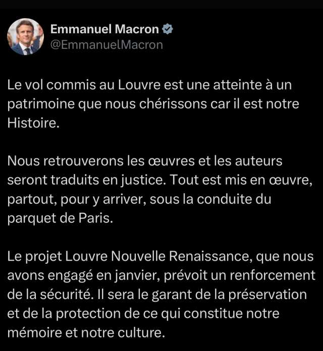 وقال ماكرون في منشور عبر حسابه الرسمي على موقع التواصل الاجتماعي إكس: “السرقة التي ارتُكبت في متحف اللوفر هي اعتداء على تراث نعتزّ به لأنه يمثل تاريخنا.