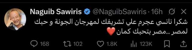 وكتب ساويرس تغريدة في حب نانسي عجرم، عبر حسابه الشخصي بمنصة التغريدات المصغرة “إكس” قائلًا: “شكرًا نانسي عجرم على تشريفك لمهرجان الجونة وحبك لمصر، مصر بتحبك كمان”.
