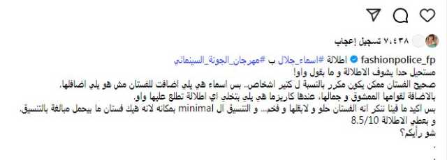 .وجاء تعليق ناقد الموضة اللبناني إيلي حنا على إطلالتها عبر صفحتة الرسمية شرطة الموضة، قائلًا: "