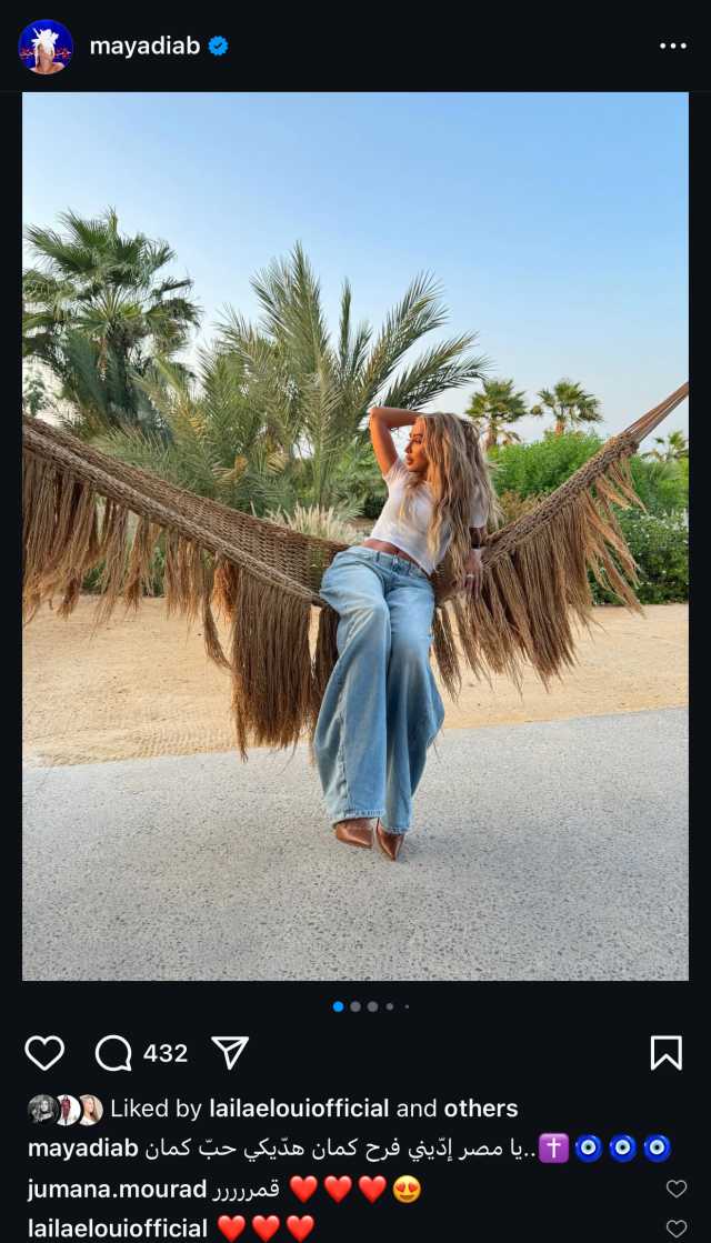 شاركت الفنانة مايا دياب بعض الصور أثناء تواجدها في مصر، عبر حسابها الشخصي بموقع إنستجرام وعلقت على الصور قائلة: "يامصر إديني فرح كمان، هديكي حب كمان".