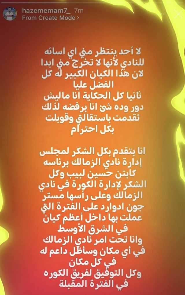 وفي بيانه، قال إمام إنه لا أحد ينتظر منه أن يُسيء للنادي، لأن تلك الأفعال «لا تخرج منه أبدًا»، مؤكدًا أن الكيان الأبيض له كل الفضل عليه، وأنه لا يقبل الاستمرار إذا ما لم يكن له دور فعلي. ثم ووجّه الشكر لمجلس إدارة الزمالك برئاسة حسين لبيب، وإلى إدارة الكرة وعلى رأسها جون إدوارد، على الفترة التي قضاها ضمن أسرة النادي، مشيرًا إلى أنه سيظل داعمًا للزمالك في أي مكان يكون فيه.