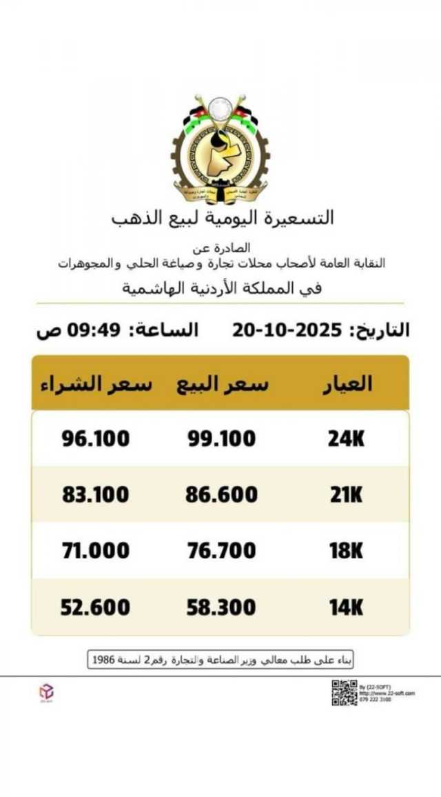 انخفضت #أسعار #الذهب في الأسواق المحلية، الاثنين، 40 قرشا للغرام الواحد، وفق التسعيرة اليومية الصادرة عن النقابة العامة لأصحاب محلات صياغة وتجارة الحلي والمجوهرات.وبلغ سعر بيع #غرام_الذهب من عيار 21، الأكثر طلبًا بين المواطنين 86.6 دينارًا في محلات الصاغة، فيما بلغ سعر #الشراء 83.1 دينارًا، بانخفاضه بمقدار 40 قرشا.