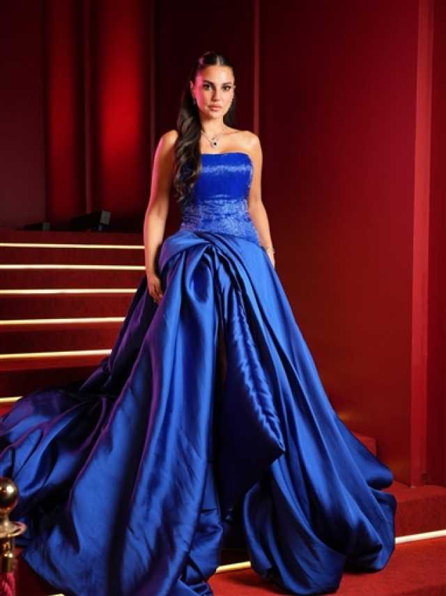 وظهرت الفنانة درة بإطلالة أميرية جذابة، حيث تألقت بفستان فاخر من تصميم صوفي كوتور باللون الأزرق الأنيق وبدون أكمام، تميز الجزء العلوي منه بلمعانه اللافت، بينما جاء الجزء السفلي بثنيات على شكل وردة تضفي عليه لمسة من الرقي والجمال.