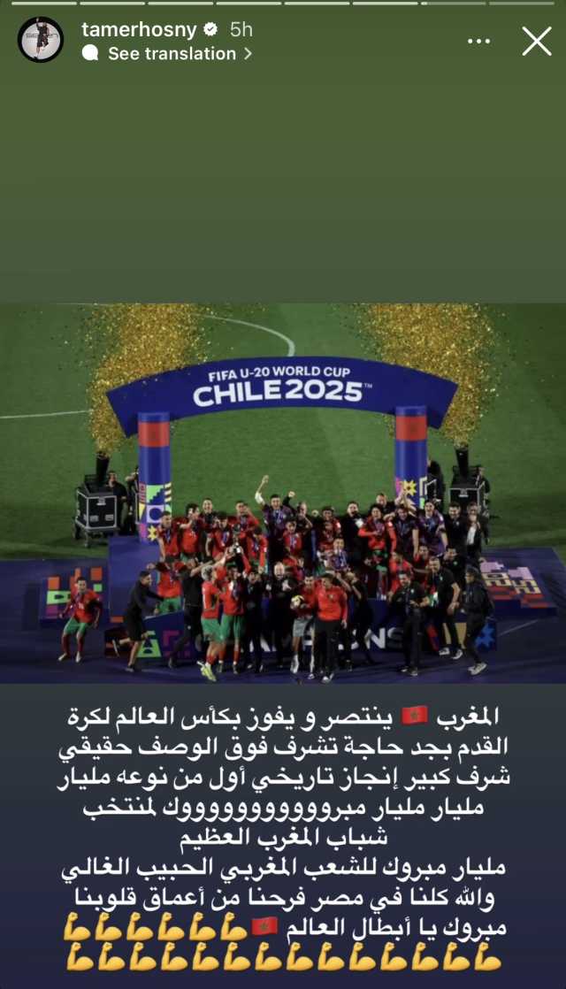 وكتب تامر حسني عبر ستوري على حسابه بموقع التواصل الاجتماعي للصور والفيديوهات انستجرام: “المغرب ينتصر بجد حاجة تشرف فوق الوصف حقيقي شرف كبير وانجاز تاريخي أول من نوعه مليار مبروك لمنتخب شباب المغرب العظيم”.