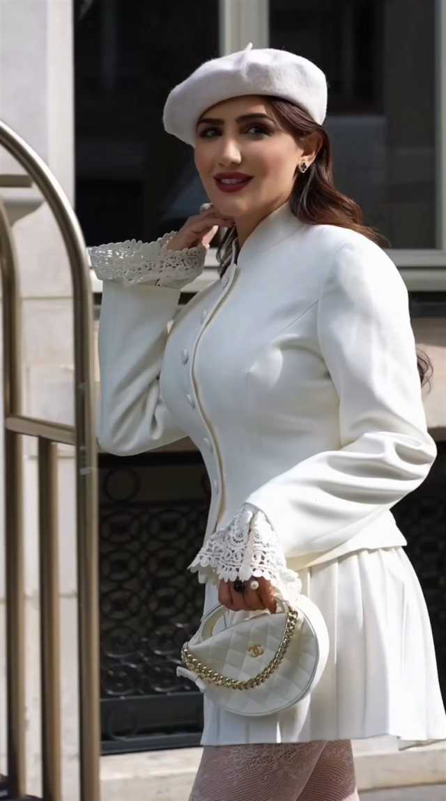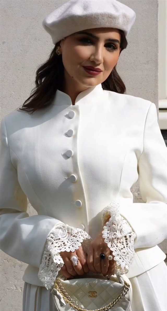 وظهرت مي عمر بإطلالة بيضاء بالكامل، ضمت بليزر مطرز بأزرار أنيقة وبأكتاف مرتفعة قليلاً، ونسقت معه ميني جيب بليسيه، وكولون من الدانتيل، ليعطي لمسة فخامة مع أنوثة لافتة.