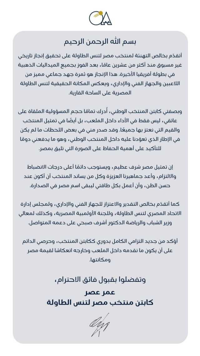 وقال عمر عصر عبر صفحته الرسمية على موقع فيسبوك: “أتقدم بخالص التهنئة لمنتخب مصر لتنس الطاولة على تحقيق إنجاز تاريخي غير مسبوق منذ أكثر من 20 عامًا، بعد الفوز بجميع الميداليات الذهبية في بطولة إفريقيا الأخيرة”.