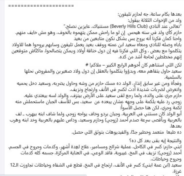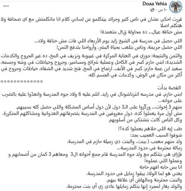 نشرت والدة الطالب “حازم” رواية مؤلمة عبر "فيسبوك"، أكدت فيها أن ما حدث “محاولة قتل متعمدة وليست خناقة أولاد”، قائلة: "جوزي في العناية المركزة بين الحياة والموت، وابني عامل عملية شرائح ومسامير، وسعيد ابن عمته مصاب بارتجاج. كل ده لأننا حاولنا نحل المشكلة بالعقل، لكن اللي حصل كان مدبر من البداية".