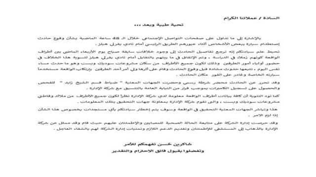 وأضافت الإدارة أنها تتابع الحالة الصحية للمصابين وقدمت لهم الدعم اللازم، مؤكدة تعاونها الكامل مع السلطات لكشف ملابسات الواقعة.