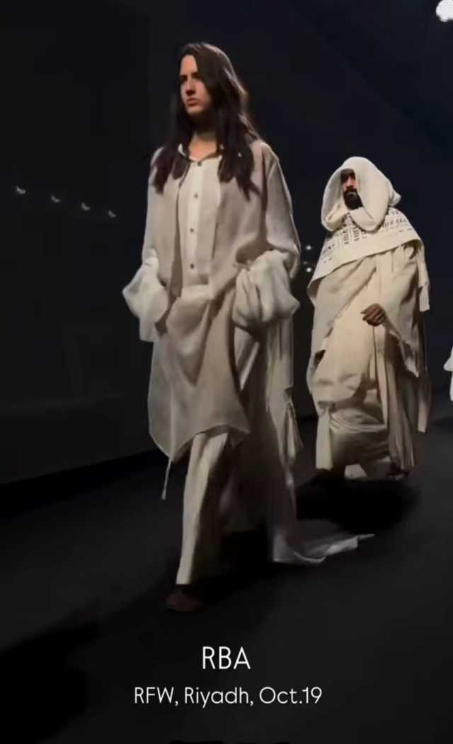 تضمّنت المجموعة فساتين فضفاضة بيضاء وأطقم رجالية من الكتان بأسلوب البوهيمية المريح، إضافة إلى معاطف طويلة باللون البني مع أغطية رأس مستوحاة من الملابس البدوية، وأزياء رجالية فضفاضة، وامتد الإبداع إلى تفاصيل العرض، حيث ظهر العارضون حاملين صقورًا على أيديهم، في مشهد يجسد الثقافة العربية وروحها الأصيلة.