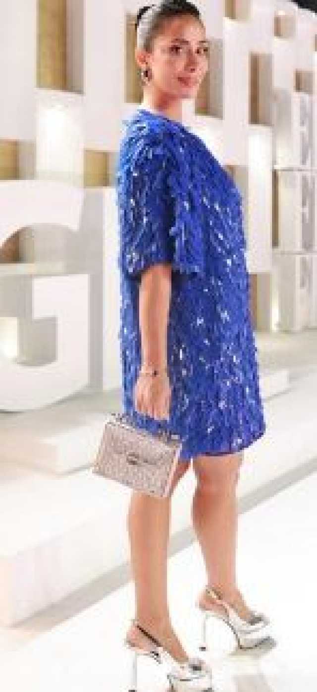 وبدت بسنت شوقي بإطلالة لافتة، مرتدية فستان قصير فضفاض، بأكمام طويلة، صمم من قماش الترتر اللامع لتواكب موضة فساتين خريف 2025.