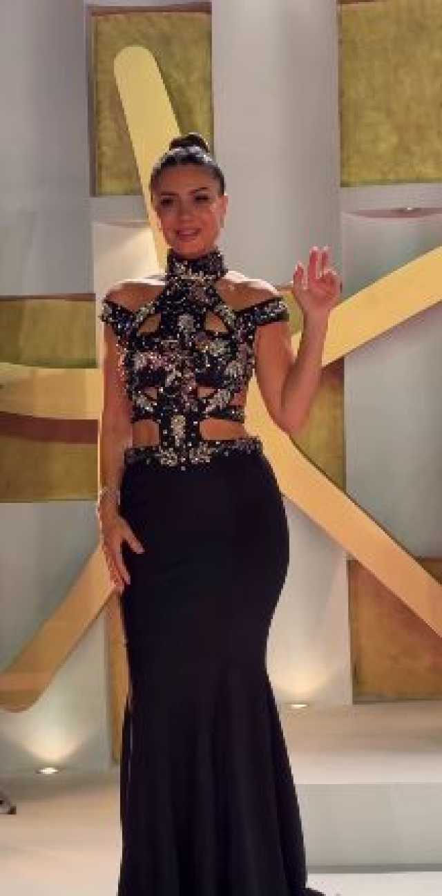 وبدت نجلاء بإطلالة جديدة مرتدية فستان طويل، صمم من قماش المخمل المطرز بحبيبات الخرز الفضي مع اللافندر لتناغم مع الساتان باللون الأسود.