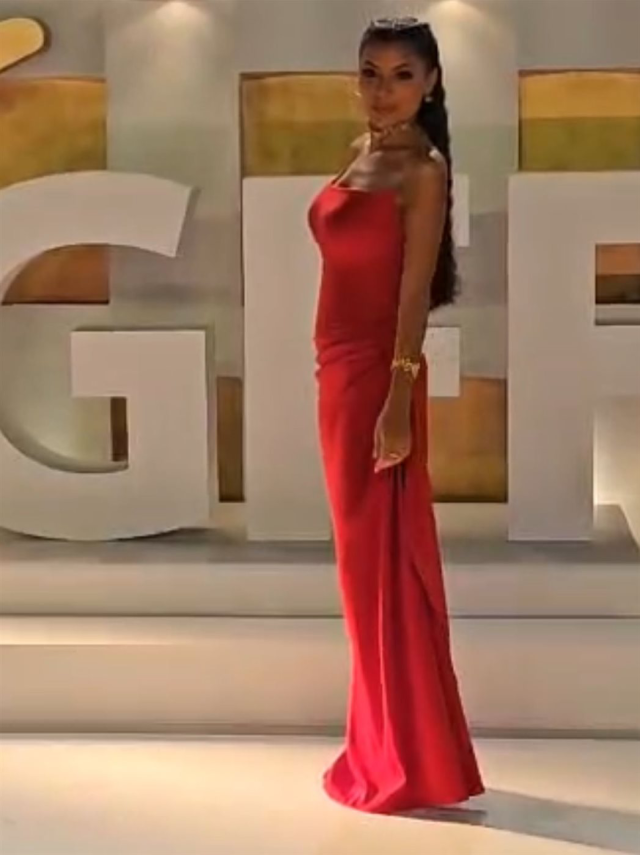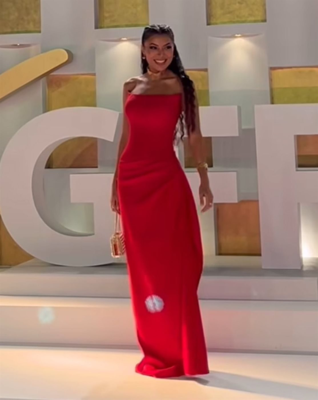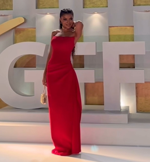 أطلت بسمة داود بفستان أحمر لافت، وجاء طويلًا، وينتمي لأحدث صيحات فساتين الكب، كما وضعت مكياجًا صارخًا يتناغم مع إطلالتها على السجادة الحمراء.