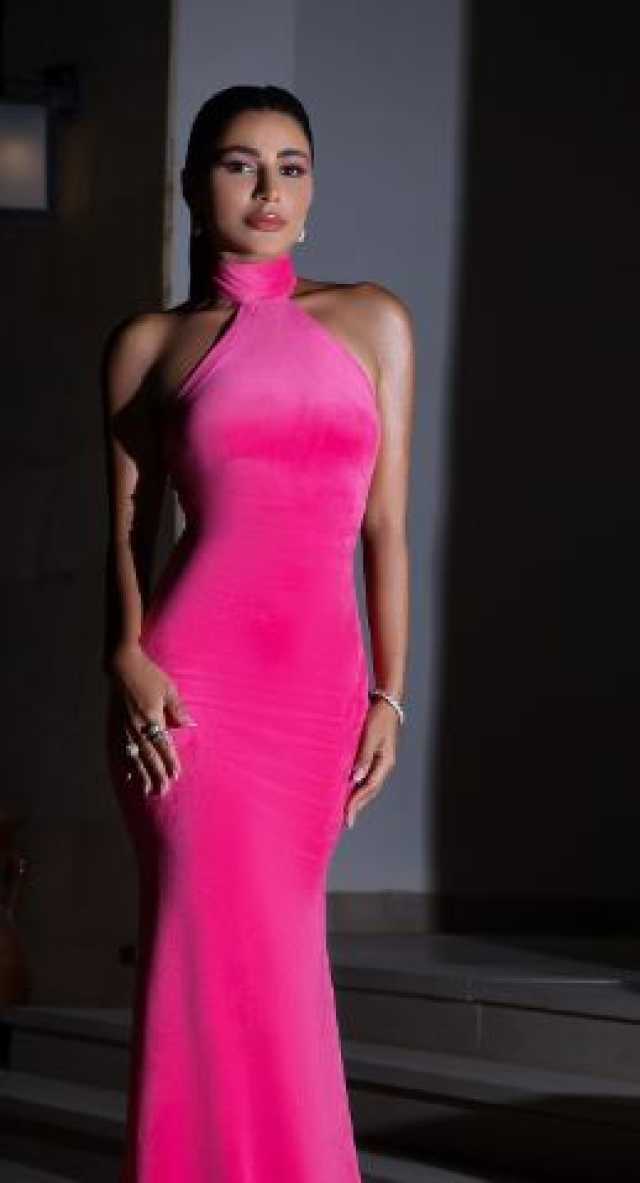 وبدت مهيرة عبدالعزيز بإطلالة ساحرة، مرتدية فستان طويل، بلياقة عالية، صمم من قماش المخمل باللون البينك، وفضلت لم خصلات شعرها للوراء ذيل حصان ووضعت لمسات ناعمة من المكياج المرتكز على الألوان الترابية مع تحديد عينيها بالكحل والماسكرا السوداء ولون الكشمير في الشفاه.