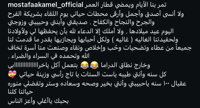 واختتم مصطفى كامل رسالته بكلمات مليئة بالحب قائلاً: “كل سنة وأنتِ طيبة يا ست الستات، يا تاج رأسي وزينة حياتي، عقبال 100 سنة يا حبيبتي وأنتِ بخير وصحة وسعادة وستر، وتفضلي منوّرة حياتنا كلنا. بحبك يا أغلى وأعز الناس".
