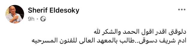 وكتب شريف الدسوقي عبر حسابه الشخصي بموقع فيسبوك: “دلوقتي أقدر أقول الحمد والشكر لله، آدم شريف الدسوقي طالب بالمعهد العالي للفنون المسرحية”.