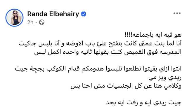 وكتبت راندا البحيري في منشورها: “هو فيه إيه يا جماعة! أنا لما بنت عمتي كانت بتفتح عليّ باب الأوضة وأنا بلبس جاكيت المدرسة فوق القميص كنت بقولها ثانية واحدة أكمل لبس.