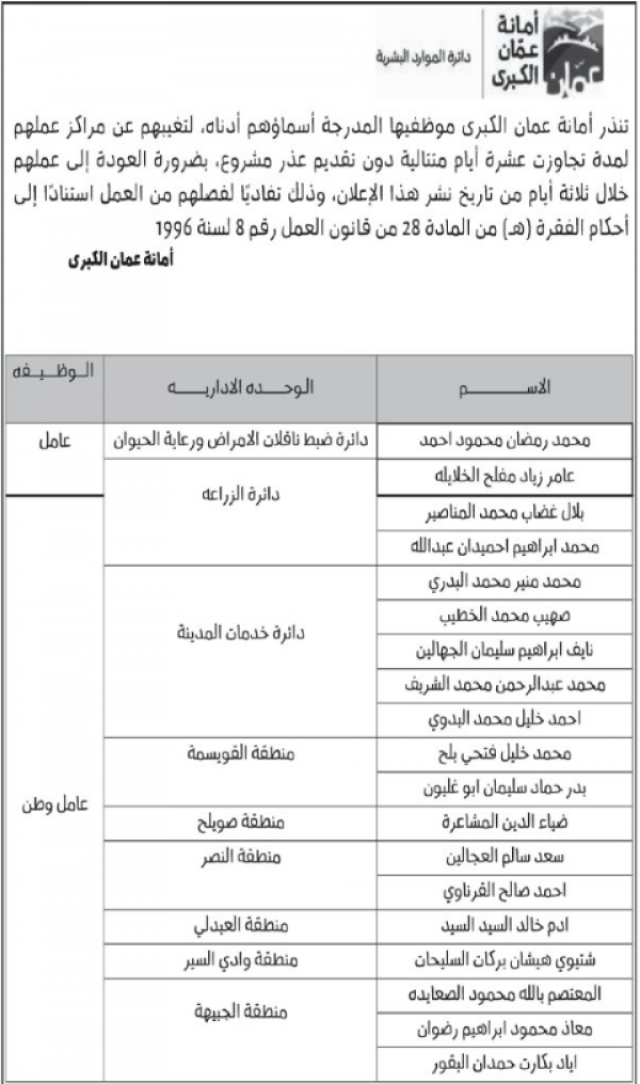 صراحة نيوز-أنذرت أمانة عمان الكبرى موظفيها المدرجة أسماؤهم أدناه، لتغيبهم عن مراكز عملهم لمدة تجاوزت عشرة أيام متتالية دون تقديم عذر مشروع، بضرورة العودة إلى عملهم خلال ثلاثة أيام من تاريخ الإعلان تفاديا لفصلهم.