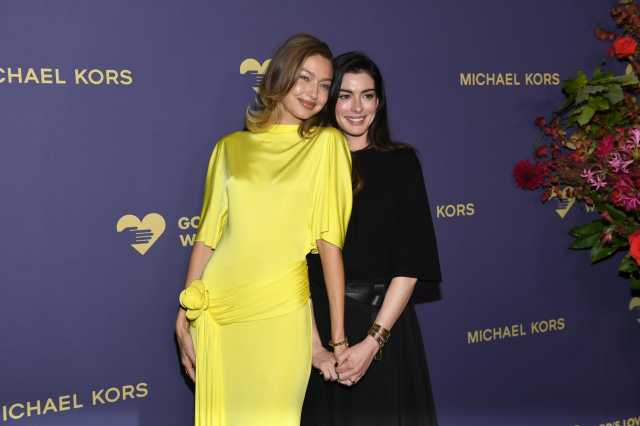 وشاركت حديد لحظات دافئة مع آن هاثاوي، التي ظهرت بفستان أسود طويل مع أكمام كاملة، ونسّقته مع حزام جلدي، وتسريحة شعر مموحة، ومكياج ناعم.