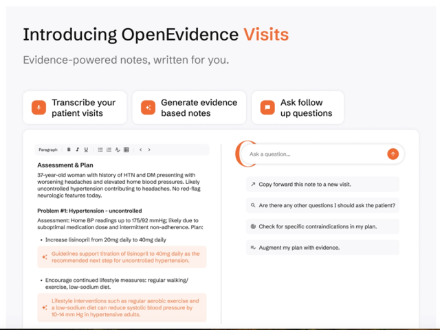 تُوصف منصة OpenEvidence بأنها بمثابة "شات جي بي تي للأطباء"، إذ تمكّن الأطباء والممرضين من الوصول السريع إلى الأبحاث الطبية والمراجع العلمية، وتحليلها بلغة طبيعية تساعد في اتخاذ قرارات سريرية أكثر دقة وسرعة.