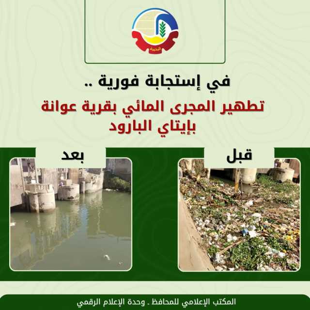 وفي استجابة سريعة لما تم رصده من شكاوى المواطنين بشأن وجود قمامة بمجرى مائي بقرية عوانة بايتاي البارود، على الفور تواصل المكتب الإعلامي للمحافظ، وتم التنسيق مع الإدارة المتكاملة للمخلفات بالمحافظة، والوحدة المحلية، وهندسة الري، وتم رفع جميع المخلفات وتطهير المجرى بالكامل.