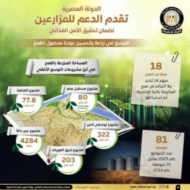 وعلى صعيد المساحة المنزرعة بالقمح في أبرز مشروعات التوسع الأفقي، فقد تم زراعة 322 ألف فدان قمح بمشروع توشكى الخير، وكذلك زراعة 203 آلاف فدان قمح بمشروع شرق العوينات، إلى جانب زراعة 80 ألف فدان قمح بمشروع مستقبل مصر «باكورة مشروعات الدلتا الجديدة»، بالإضافة إلى زراعة 77.8 ألف فدان قمح بمشروع الفرافرة، وزراعة 4284 فدان قمح بمشروع عين دالة، في حين تم زيادة عدد الصوامع لـ 81 صومعة عام 2025 مقابل 35 صومعة عام 2014.