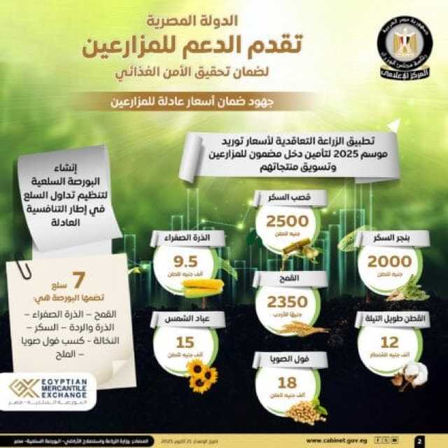 وفي إطار جهود دعم الدولة للمزارعين لضمان أسعار عادلة، أوضحت الإنفوجرافات، أنه تم تطبيق الزراعة التعاقدية لأسعار توريد موسم 2025، لتأمين دخل مضمون للمزارعين وتسويق منتجاتهم، حيث بلغ سعر توريد طن قصب السكر 2500 جنيه، وسعر توريد طن بنجر السكر 2000 جنيه، في حين بلغ سعر توريد أردب القمح 2350 جنيهًا.