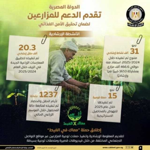 وتطرقت الإنفوجرافات إلى جهود تعزيز الأنشطة الإرشادية للمزارعين، حيث تم إطلاق نحو 15 حملة قومية خلال عام 2025، للنهوض بالمحاصيل الاستراتيجية، فضلًا عن تنفيذ 20.3 ألف حقل إرشادي لتطبيق الممارسات الزراعية الجيدة في الريف خلال عام 2024/2025، وكذلك تنفيذ نحو 31 ألف نشاط إرشادي متنوع خلال عام 2024/2025، استفاد منه حوالي 466.6 ألف مزارع، بمشاركة 1653 خبيرًا فنيًا وإرشاديًا.
