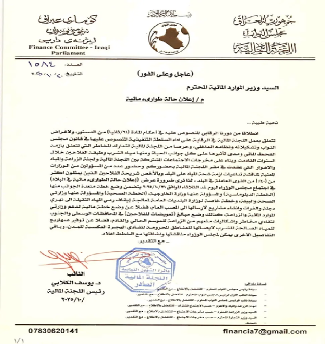 آخر تحديث: 21 أكتوبر 2025 - 1:01 م بغداد/ شبكة أخبار العراق- طالب النائب يوسف الكلابي، مجلس الوزراء، بإعلان حالة الطوارئ المائية في البلاد، بسبب ازمة الجفاف، على ان يتضمن إعلان هذه الحالة خطة لإنقاذ واقع المياه في العراق. وجاء في كتاب صدر عن الكلابي، وموجه لوزير الموارد المائية، أنه “حرصا من اللجنة المالية النيابية، لتدارك المخاطر التي تتعلق بازمة القحط المائي ومدى تأثيرها على كل جوانب الحياة ومنها مياه الشرب وطبقة الفلاحين خلال السنوات القادمة، وبناء على مخرجات الاجتماعات المشتركة بين اللجنة المالية ولجنة الزراعة والمياه والاهوار التي عقدت في مقر اللجنة المالية بحضوركم وحضور عدد من المسؤولين من الوزارات المعنية لمناقشة تداعيات أزمة شحة المياه على البلد”.