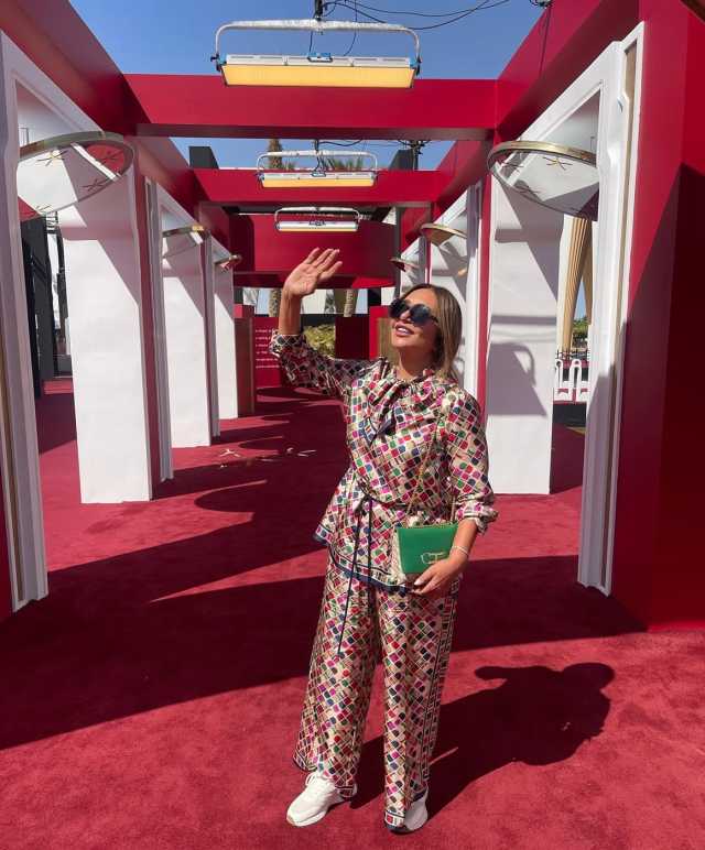 ونسقت معه حذاء رياضي باللون الأبيض، وحملت حقيبة كروس باللون البيج والأخضر؛ لتتناغم مع اللوك المبهج .