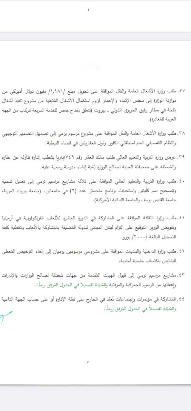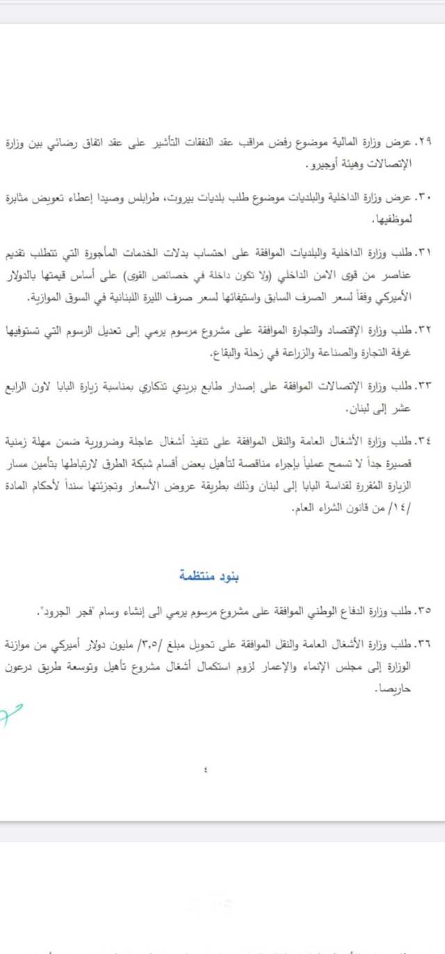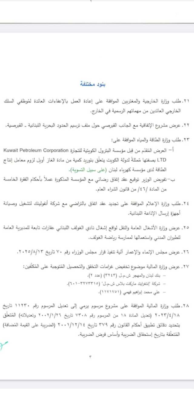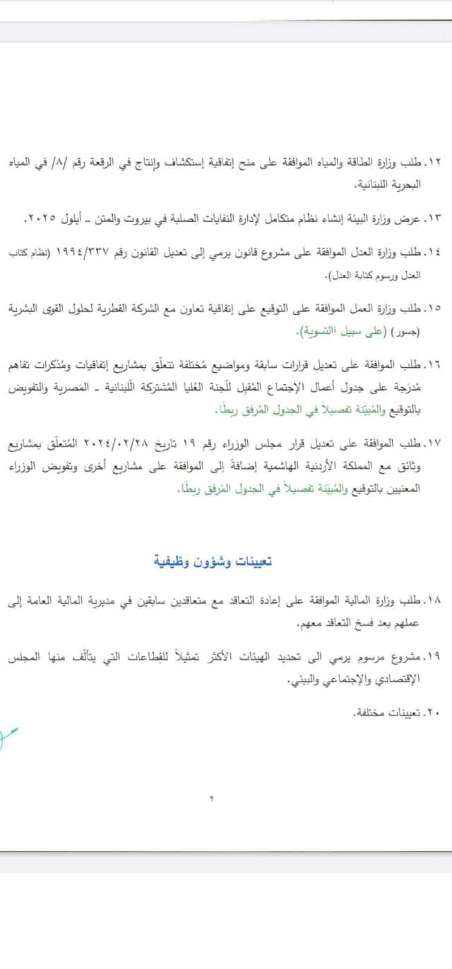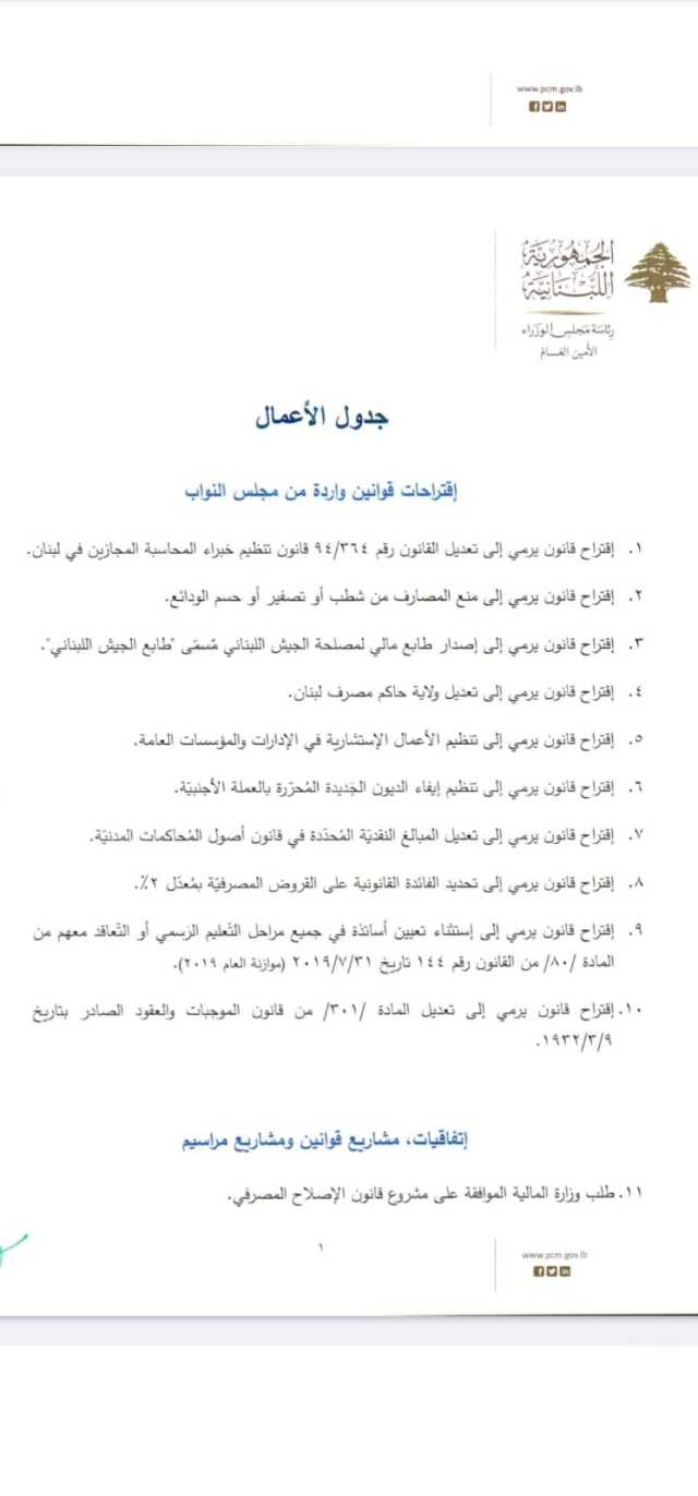 يعقد مجلس الوزراء جلسة عند الساعة الثالثة من بعد ظهر يوم الخميس 23-10-2025، في القصر الجمهوريّ، لبحث المواضيع المبيّنة في جدول الأعمال أدناه.