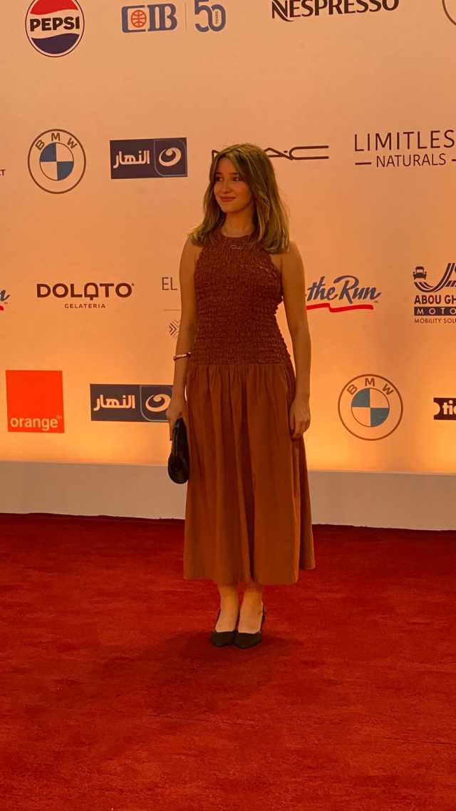 أما الممثلة المصرية نيللي كريم، فقد اختارت فستانًا تميز بفتحة منخفضة عند الصدر وشقوق جانبية في التنورة.